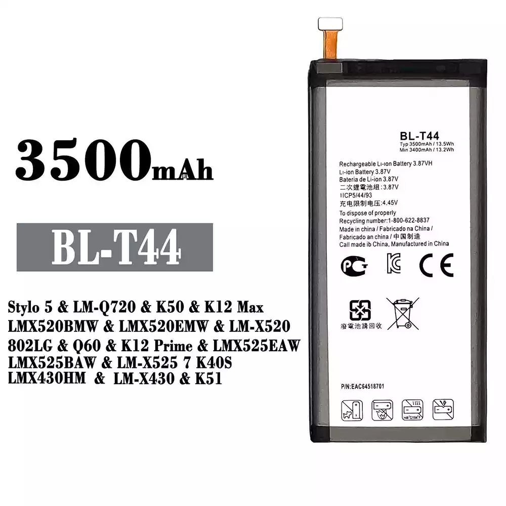 Aккумулятор BL-T44 Применимый к LG Stylo 5 / LM-Q720 / K50 / K12 Max / LMX520BMW / LMX520EMW / LM-X520 / 802LG / Q60 / K12 Prime / LMX525EAW / LMX525BAW / LM-X525 7 K40S / LMX430HM / LM-X430 / K51