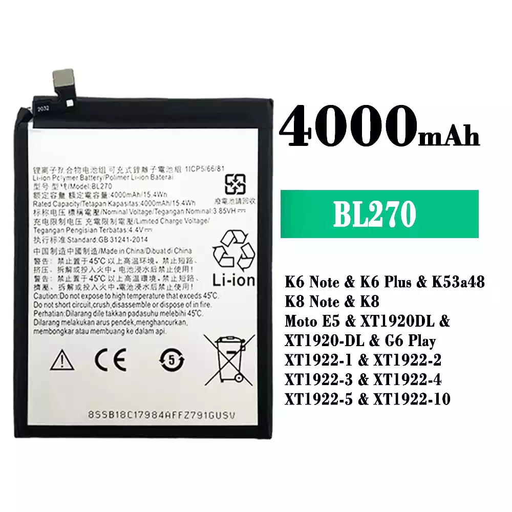 Aккумулятор BL270 Применимый к Lenovo K6 Note / K6 Plus / K53a48 / K8 Note / K8 / Moto E5 / XT1920DL / XT1920-DL / G6 Play / XT1922-1 / XT1922-2 / XT1922-3 / XT1922-4 / XT1922-5 / XT1922-10