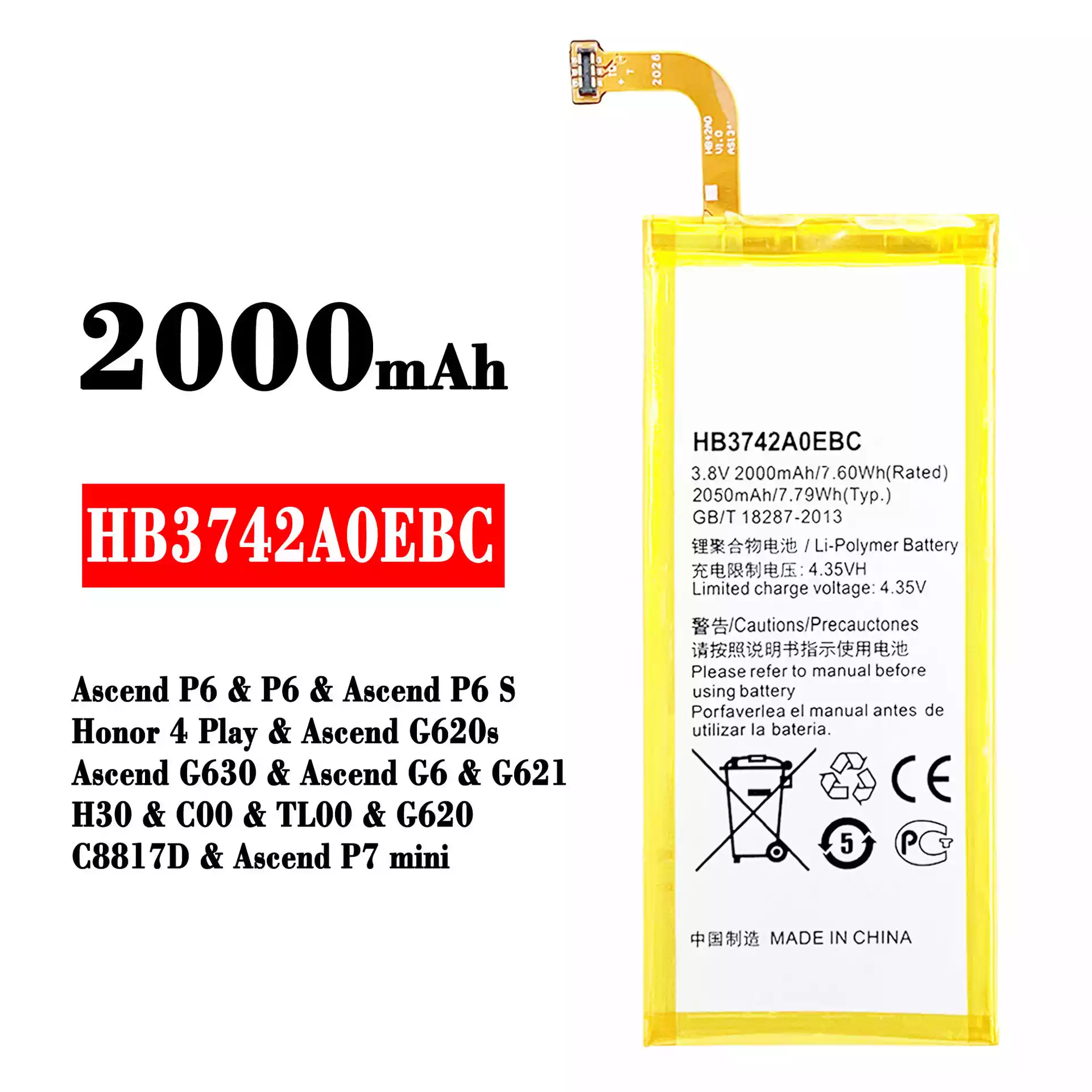 Aккумулятор HB3742A0EBC Применимый к HUAWEI Ascend P6 / P6 / Ascend P6 S / Honor 4 Play / Ascend G620s / Ascend G630 / Ascend G6 / G621 / H30 / C00 / TL00 / G620 / C8817D / Ascend P7 mini